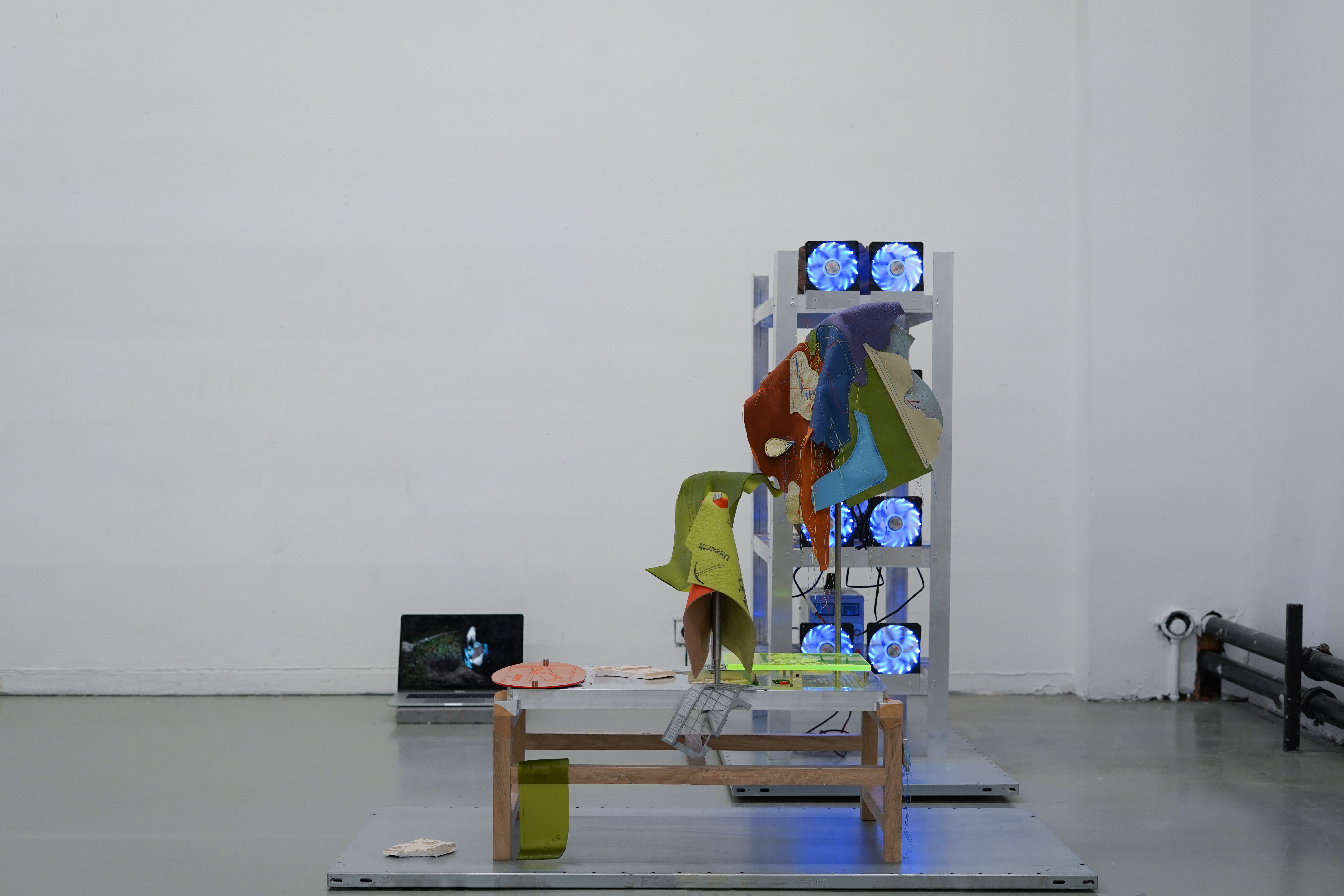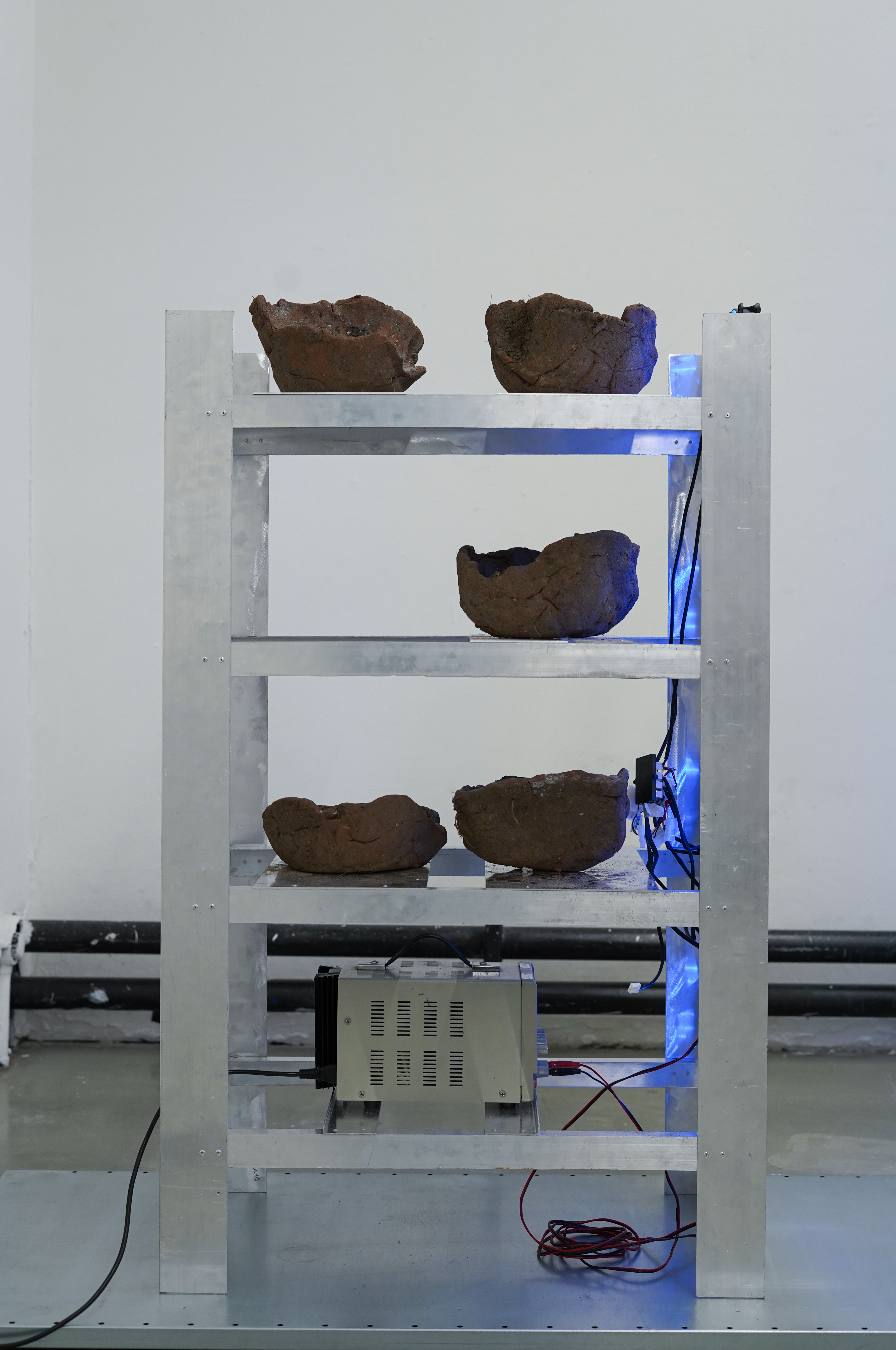 He investigates the complex narratives in the digital currency by layering various archetypal visual data and symbolic objects to illustrate the amalgamation between physical and digital. By doing so, he refuses to explain the complexity of the generic concept of the system but rather focus on the societal phenomenon around the subject with tangible matter that responds to itself. Contemporary meme as analysis to understand the complexity of value fluctuation, and physical mining as a verb and as a methodology to tie back to the digital mining process.